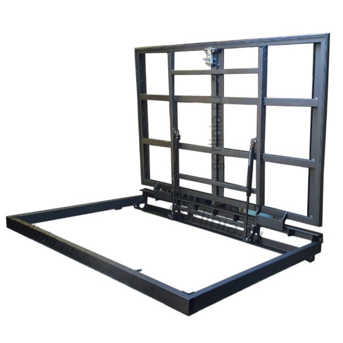 Скрытый короб из профиля 50х25 без наличника крепят в торец перекрытия на расчетную отметку над уровнем чистовых полов. Со стороны оси открывания на паразитку приходит деревянный пол до 35 мм с подрезкой в четверть 15 мм, отступом 4-6 мм от края полки по месту. Дверь обшивается доской 25 мм с запилом торца на угол, как на схеме, для свободного хода двери на газовых амортизаторах до угла распахивания 88° при зазоре 2-4 мм на петлевым узлом.